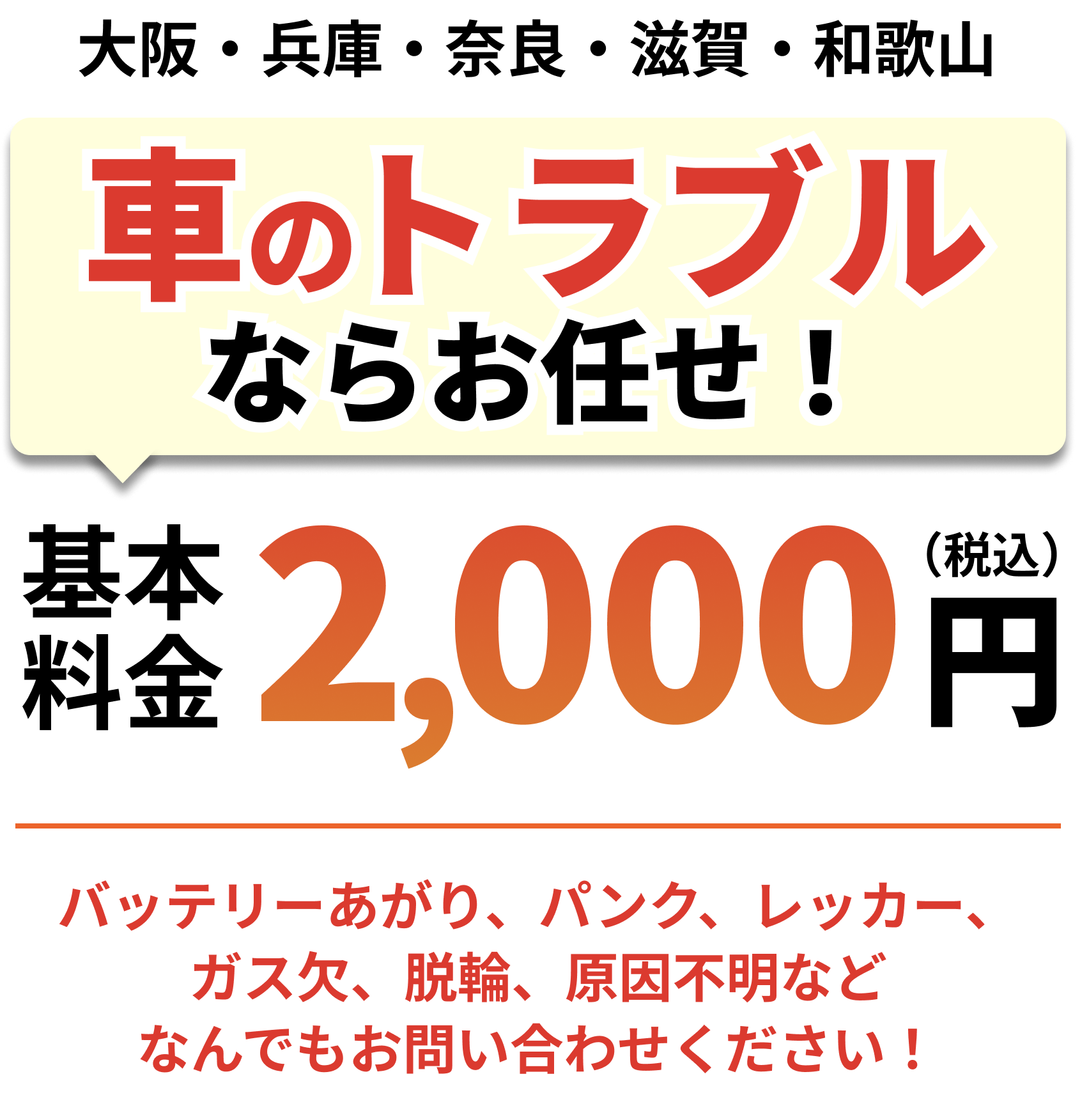 関西で発生した車のトラブルには、お問い合わせから最短10分24時間365日いつでも現場へ急行します。